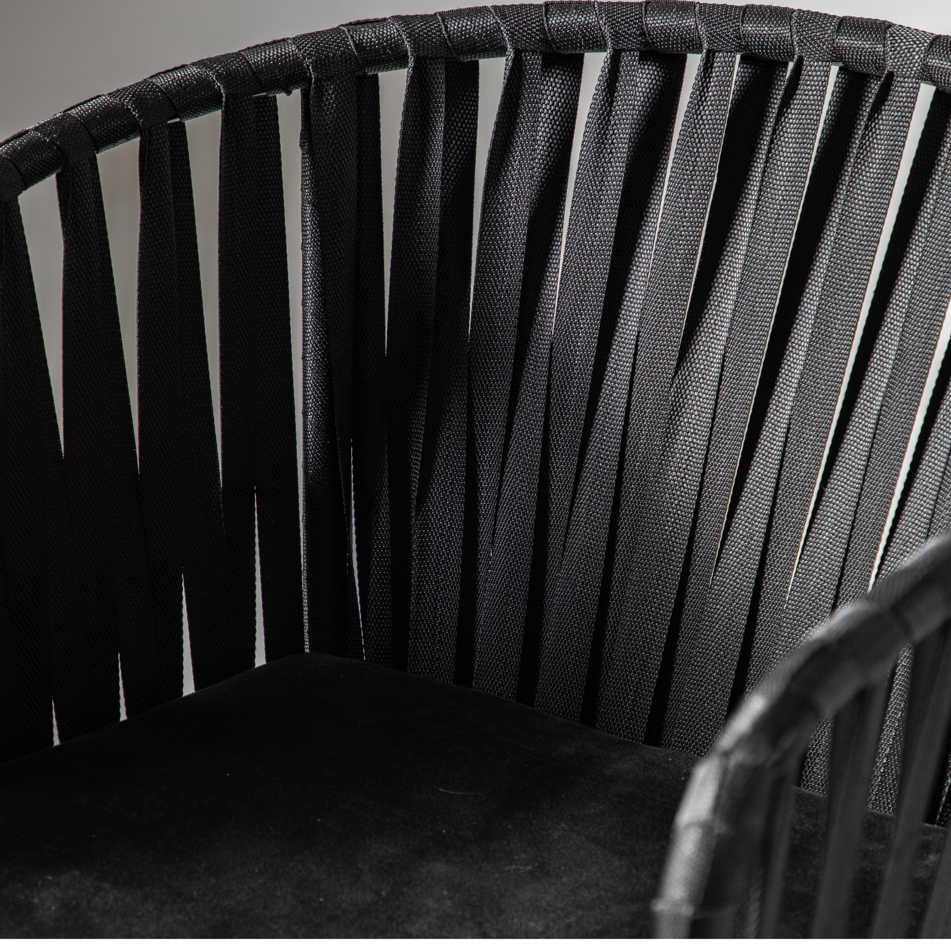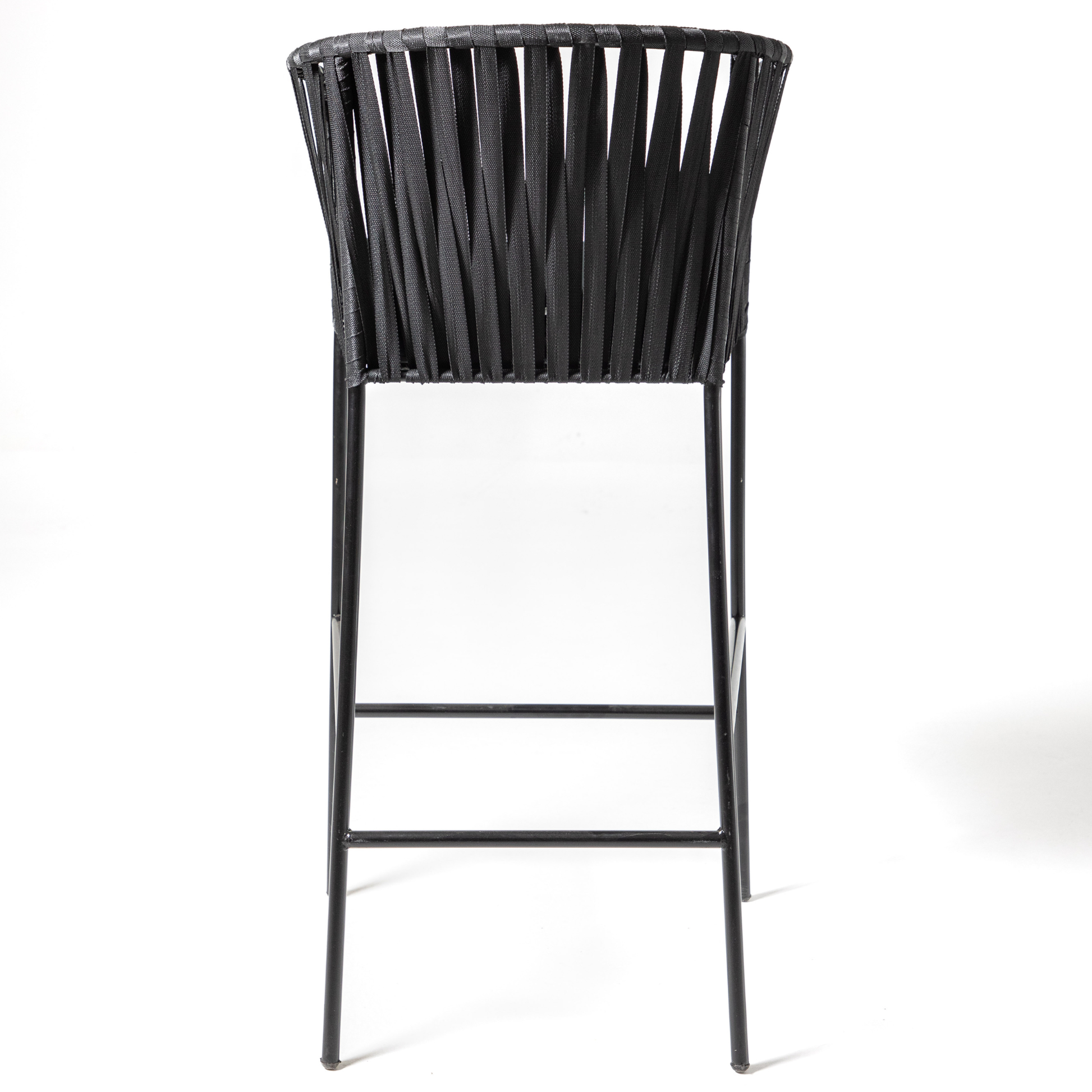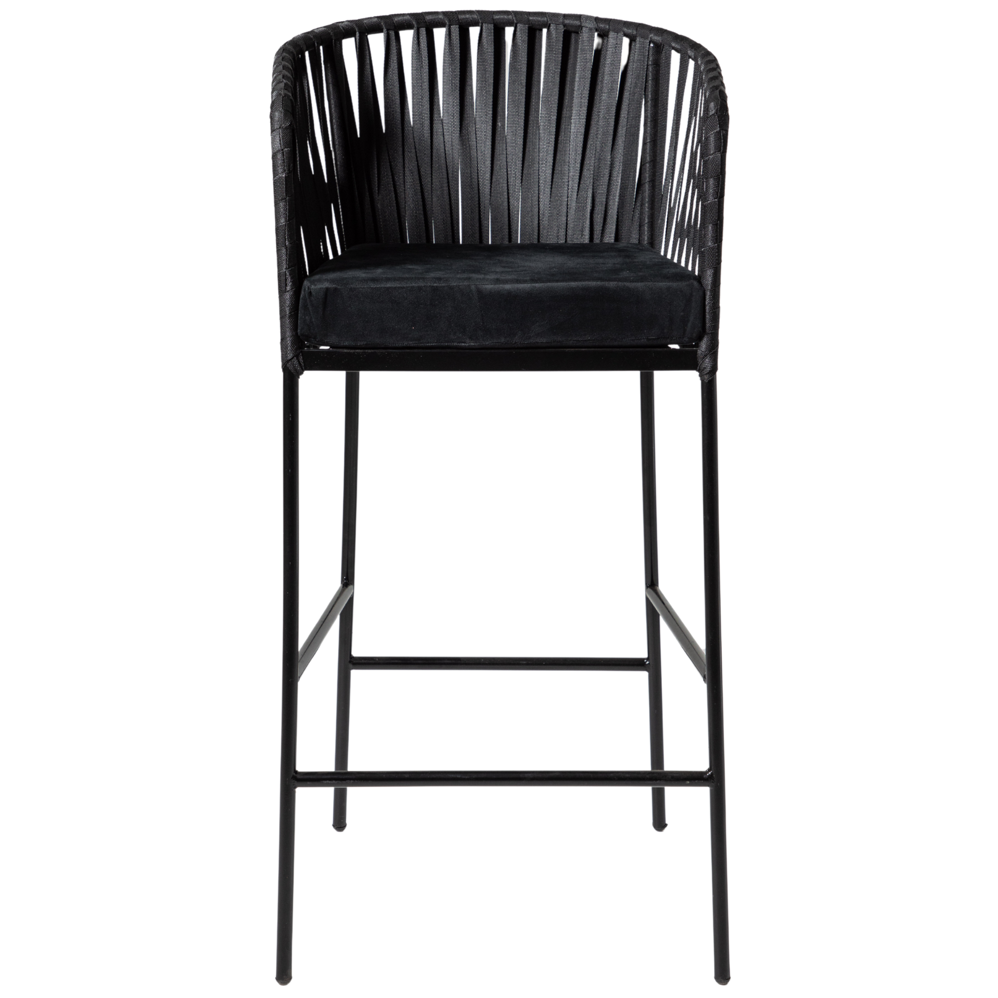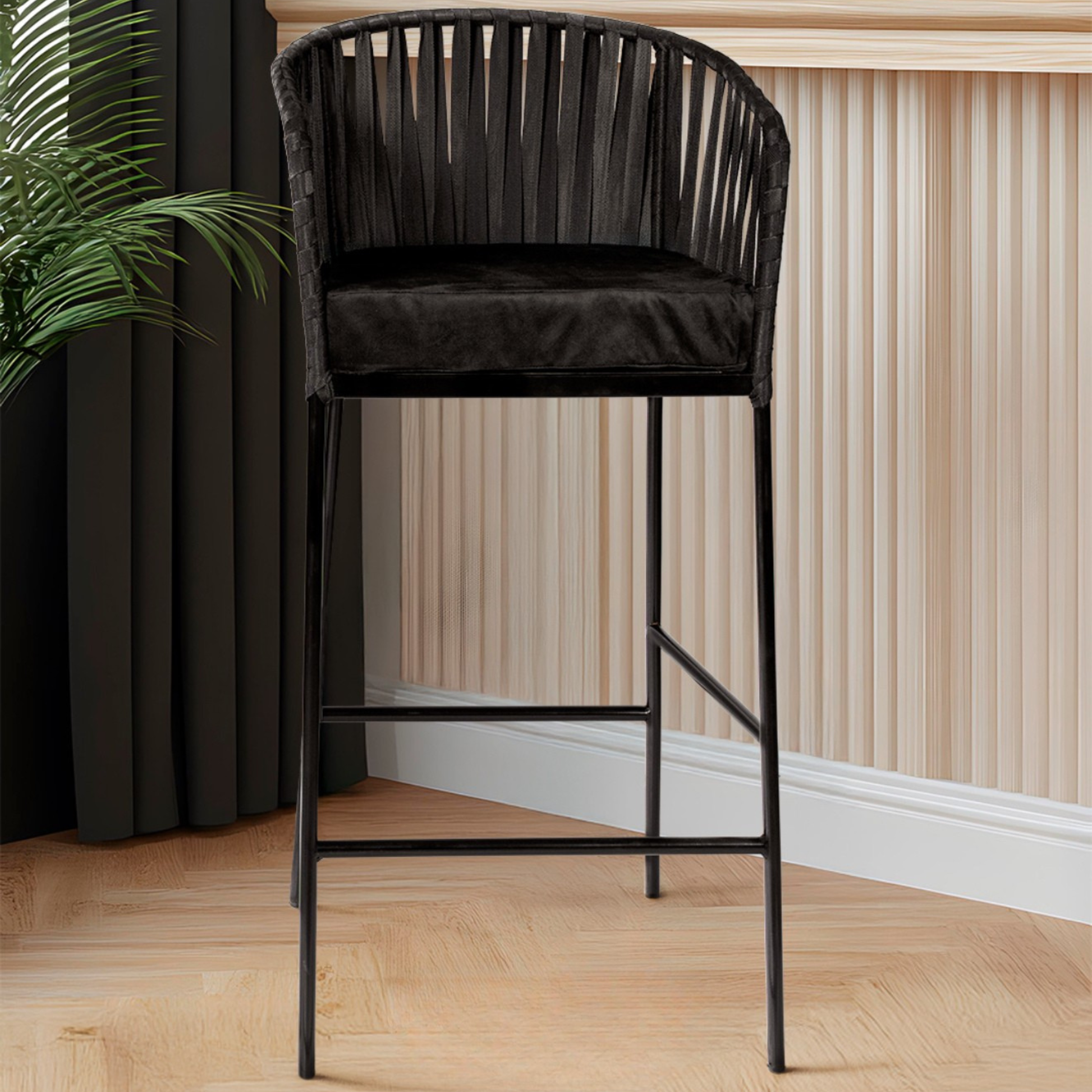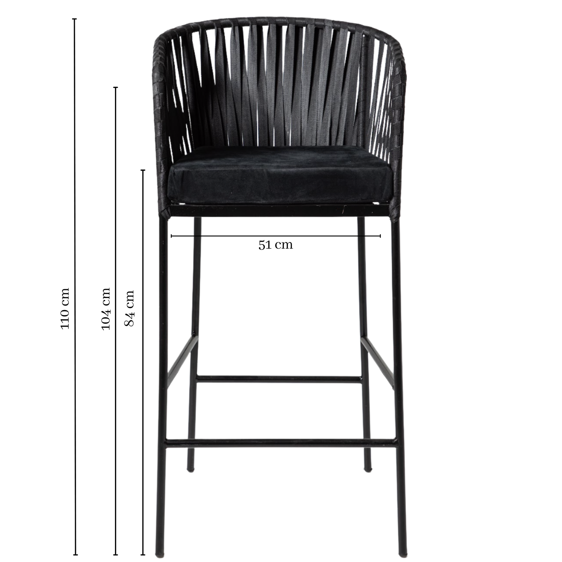 Comodidad absoluta. Es la opción ideal para barras, cocinas abiertas o espacios exteriores con estilo. Su respaldo tejido a mano y estructura metálica crean una pieza versátil que combina funcionalidad y estética.